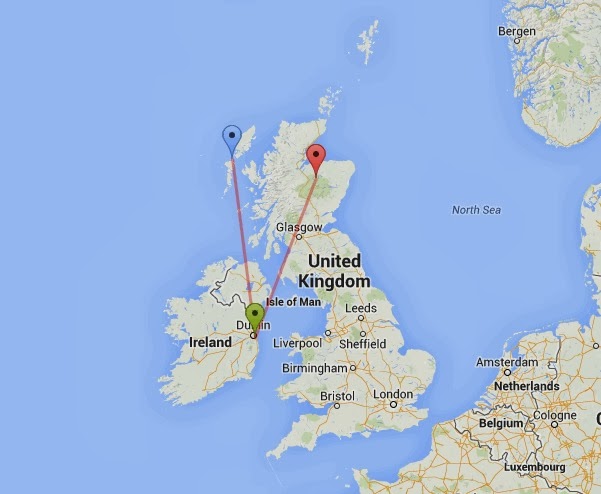 | Blue: North Uist, where FH was ringed. Red: Wester Fodderletter, where HD was ringed. Green: Sandymount Strand - wintering grounds for both birds. |